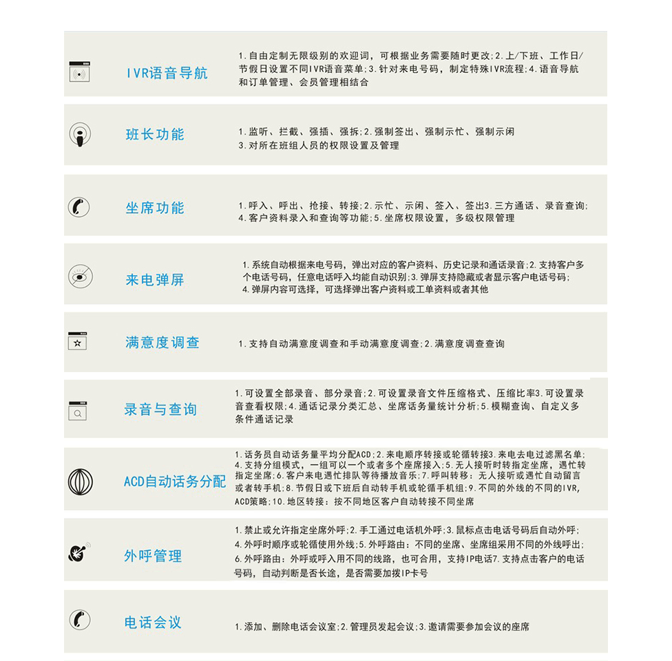 1. 具有來。去電彈屏. 鼠標(biāo)撥號. 錄音. 客戶信息輸入. 分婁. 編組. 修改. 編輯. 導(dǎo)入導(dǎo)出