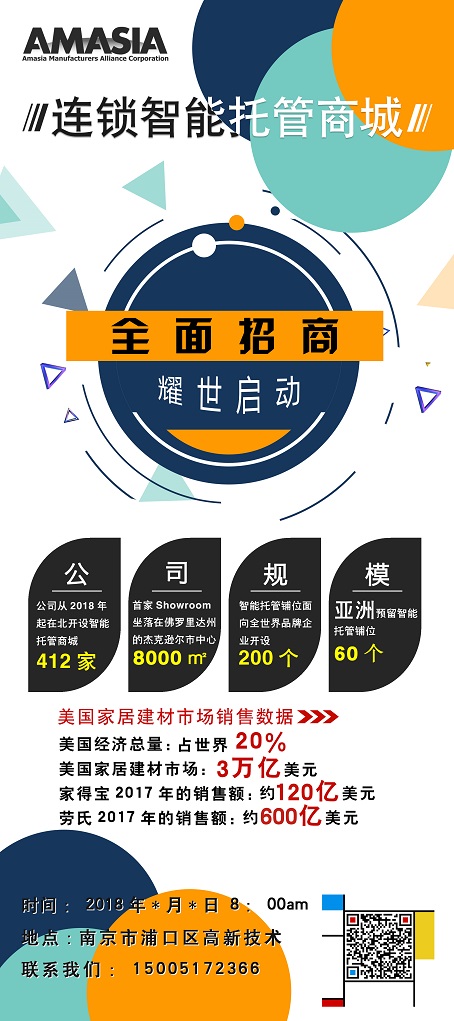 美國(guó)AMASIA家居建材連鎖智能托管商城首家位于佛羅里達(dá)州的杰克遜維爾市中心,主營(yíng)業(yè)務(wù)為:家居裝飾、建筑材料、連鎖智能托管商城、網(wǎng)上家居建材商城。商城面積8000平方米,目前正在迅速向全美各州及海外擴(kuò)展。其自由貿(mào)易區(qū)已與全球多國(guó)政府及自貿(mào)區(qū)簽訂了長(zhǎng)期戰(zhàn)略合作協(xié)議,業(yè)務(wù)往來(lái)遍布全球。在未來(lái)六至八年期間,規(guī)劃在全美擴(kuò)展400家,加拿大12家AMASIA連鎖智能托管商城。