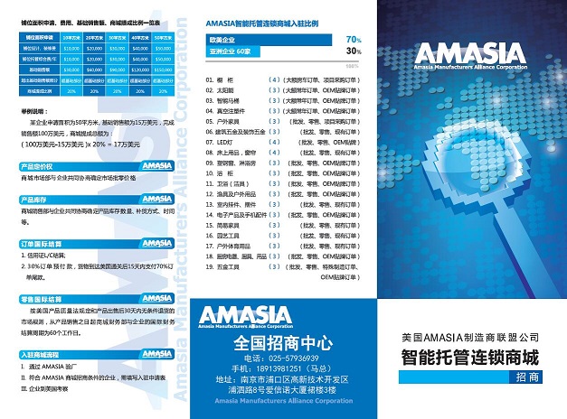AMASIA連鎖智能托管商城為增強(qiáng)客戶購(gòu)買力和大宗采購(gòu),提高商城入住企業(yè)的訂單額,特向大客戶群體采購(gòu)商發(fā)放商城 大額度信用卡 ,采購(gòu)商持信用卡在商城采購(gòu),入駐企業(yè)即刻收到貨款,而采購(gòu)商可半年后向商城還款,商城對(duì)企業(yè)端和消費(fèi)端的金融支持,將進(jìn)一步推動(dòng)企業(yè)和商城的快速發(fā)展。跟隨AMASIA連鎖智能托管商城的平臺(tái),在美國(guó)迅速入駐商鋪、打造連鎖商鋪、布局全美市場(chǎng),將使企業(yè)重塑品牌和開拓市場(chǎng)的成本最低,進(jìn)入美國(guó)市場(chǎng)的風(fēng)險(xiǎn)更低,AMASIA商城不僅是國(guó)際品牌的 孵化基地也是全球的展示中心,更是一個(gè) 永 不落幕的展銷會(huì)。