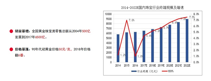 中國(guó)黃金珠寶市場(chǎng)總規(guī)模將突破萬(wàn)億,全國(guó)黃金珠寶類零售總額從2004年500億發(fā)展到2017年6500億。90年代初黃金價(jià)格50元/克,2018年價(jià)格翻6番