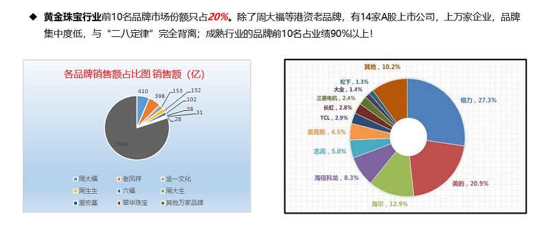 品牌集中度低,機(jī)會(huì)多。u黃金珠寶行業(yè)前10名品牌市場(chǎng)份額只占20%。除了周大福等港資老品牌,有14家A股上市公司,上萬(wàn)家企業(yè),品牌集中度低,與“二八定律”完全背離;成熟行業(yè)的品牌前10名占業(yè)績(jī)90%以上!