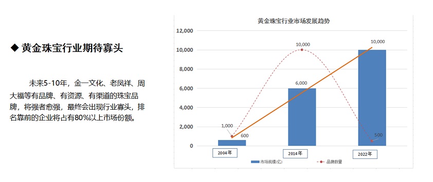 整合是大趨勢(shì),期待寡頭出現(xiàn) 。未來(lái)5-10年,金一文化、老鳳祥、周大福等有品牌、有資源、有渠道的珠寶品牌,將強(qiáng)者愈強(qiáng),最終會(huì)出現(xiàn)行業(yè)寡頭,排名靠前的企業(yè)將占有80%以上市場(chǎng)份額。