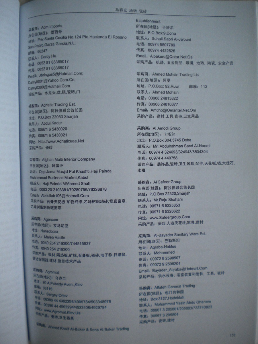 書刊簡介:《全球采商黃頁》系列叢書是由全球最活躍的專業(yè)買家及重要國際性展會的到會采購商名片信息匯編而成,包含三十多個(gè)行業(yè)分類,匯集了各類產(chǎn)品的買家信息。其中收錄的每家采購商信息均是我們通過與買家面對面的登記整理收集而成,采購意向明確,針對性強(qiáng)。為了確保信息的準(zhǔn)確性和時(shí)效性,我們定期進(jìn)行跟進(jìn)、回訪、補(bǔ)充及更新工作。每家采購商信息包括國別、公司名稱、聯(lián)系人、地址、電話、傳真、電郵、網(wǎng)址、采購產(chǎn)品等詳細(xì)內(nèi)容,每冊《黃頁》約有兩千家左右的采購商信息。在當(dāng)前國際出口形勢日趨嚴(yán)峻的環(huán)境下,如何降低成本開拓國際市場,是每個(gè)出口企業(yè)急需尋找的答案,我們相信通過我們10多年的外貿(mào)信息服務(wù)經(jīng)驗(yàn)和最新的國際買家資源服務(wù),將會為您拓展全球市場提供最直接有效的幫助。專業(yè)對口的買家信息一定會幫助貴公司打開更廣闊的外貿(mào)市場!