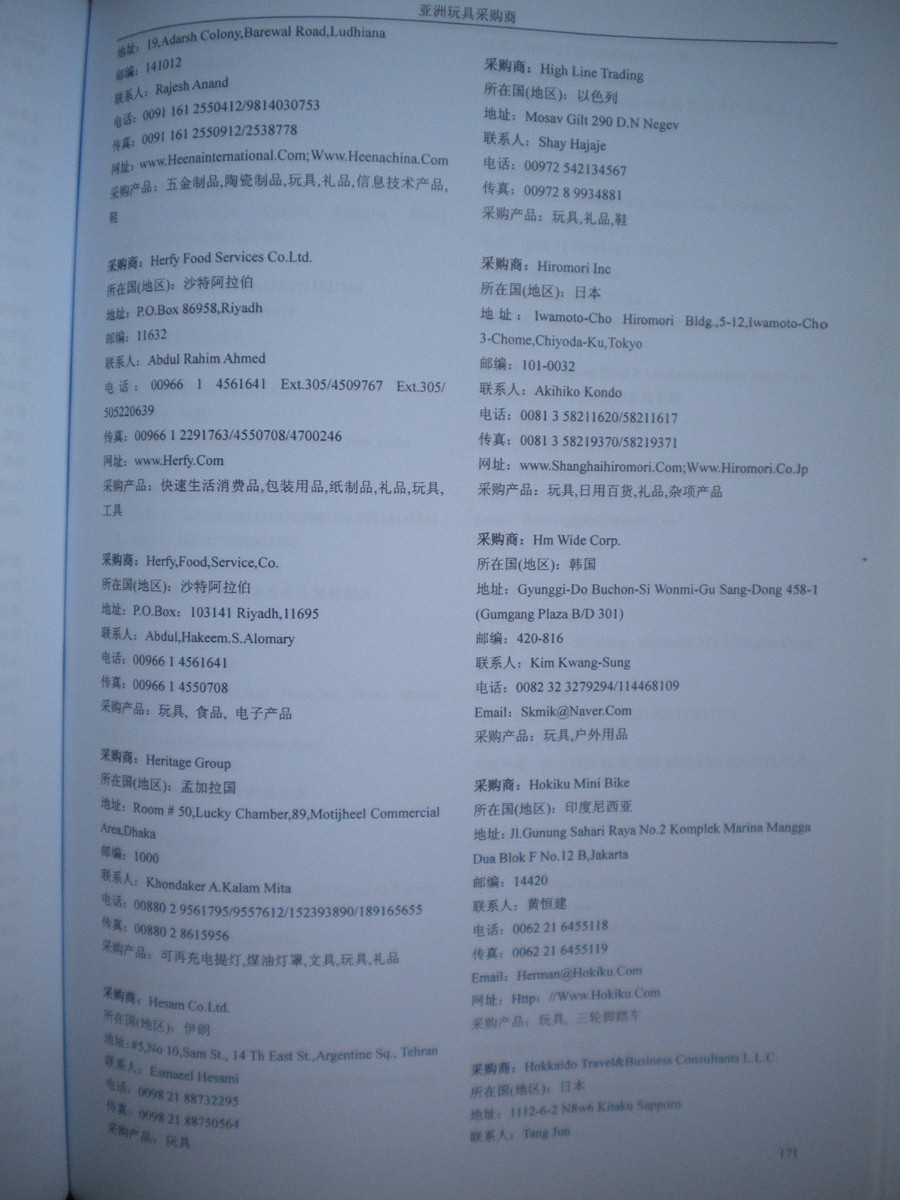 書(shū)刊簡(jiǎn)介:《全球采商黃頁(yè)》系列叢書(shū)是由全球最活躍的專業(yè)買(mǎi)家及重要國(guó)際性展會(huì)的到會(huì)采購(gòu)商名片信息匯編而成,包含三十多個(gè)行業(yè)分類,匯集了各類產(chǎn)品的買(mǎi)家信息。其中收錄的每家采購(gòu)商信息均是我們通過(guò)與買(mǎi)家面對(duì)面的登記整理收集而成,采購(gòu)意向明確,針對(duì)性強(qiáng)。為了確保信息的準(zhǔn)確性和時(shí)效性,我們定期進(jìn)行跟進(jìn)、回訪、補(bǔ)充及更新工作。每家采購(gòu)商信息包括國(guó)別、公司名稱、聯(lián)系人、地址、電話、傳真、電郵、網(wǎng)址、采購(gòu)產(chǎn)品等詳細(xì)內(nèi)容,每?jī)?cè)《黃頁(yè)》約有兩千家左右的采購(gòu)商信息。在當(dāng)前國(guó)際出口形勢(shì)日趨嚴(yán)峻的環(huán)境下,如何降低成本開(kāi)拓國(guó)際市場(chǎng),是每個(gè)出口企業(yè)急需尋找的答案,我們相信通過(guò)我們10多年的外貿(mào)信息服務(wù)經(jīng)驗(yàn)和最新的國(guó)際買(mǎi)家資源服務(wù),將會(huì)為您拓展全球市場(chǎng)提供最直接有效的幫助。專業(yè)對(duì)口的買(mǎi)家信息一定會(huì)幫助貴公司打開(kāi)更廣闊的外貿(mào)市場(chǎng)!