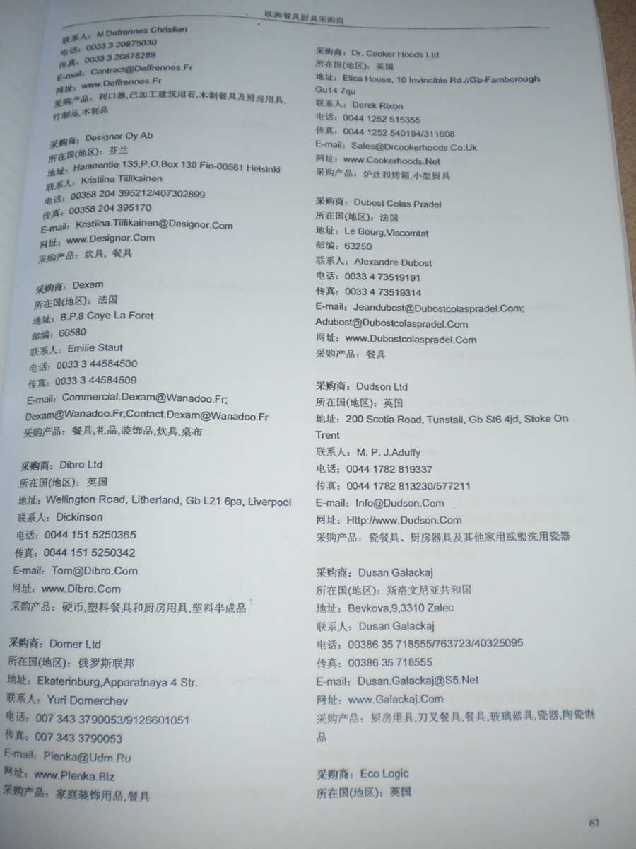 資料如何收集:在各大展會上,我們免費(fèi)向到會采購商提供他們需要的最新產(chǎn)品雜志和光盤,我們也同時向他們派發(fā)帶有我們網(wǎng)站LOGO的精美禮品,這些最新的中國供應(yīng)商的信息,對他們很有幫助,采購商會留下他們的名片,填寫詳細(xì)的產(chǎn)品求購信息,以期望得到更多的供應(yīng)商的信息。收集到這些第一手的原始外商資料后,我們客戶服務(wù)中心立刻將名片掃描作成圖片,將產(chǎn)品采購信息做成數(shù)據(jù)庫,將采購商資料按行業(yè)不同,匯編成冊,出版發(fā)行《全球采購商黃頁》系列。