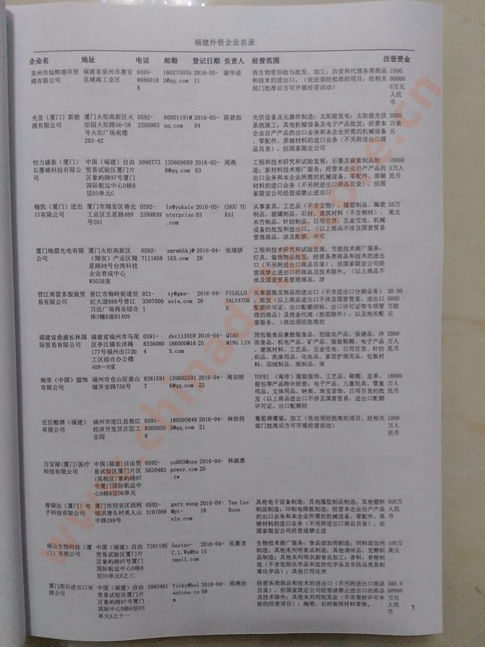 最新福建外資企業(yè)黃頁涵蓋了福建外商獨資企業(yè)、中外合資經(jīng)營企業(yè)以及港、澳、臺資企業(yè),包括福建日資臺資企業(yè)黃頁,福建外企黃頁具體內(nèi)容包括:企業(yè)名稱、地址、電話、傳真、郵箱、經(jīng)營范圍、注冊資金等信息;福建外資企業(yè)名單里面的企業(yè)都一些中外合資的大企業(yè),這些公司經(jīng)濟實力都比較雄厚,出口產(chǎn)品也比較多,業(yè)務范圍都比較廣,跟他們開展業(yè)務往來都比較容易;有了福建日企臺企黃頁開展業(yè)務也有了針對性,也省去了盲目去尋找客戶名單而浪費的時間了,工作效率也會有很大的提高.歡迎需要的客戶及時聯(lián)系我們!