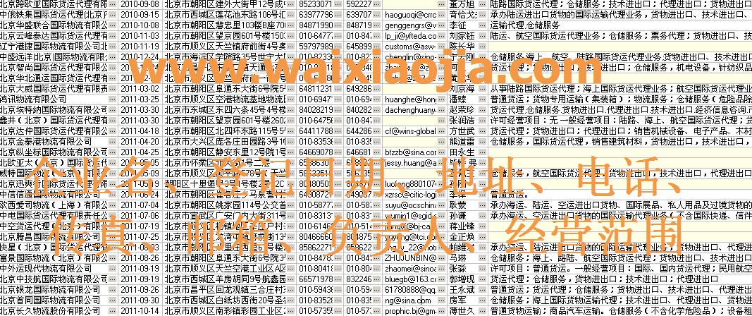 北京貨運公司黃頁包括:企業(yè)名稱、負責人聯(lián)系方式、企業(yè)電話、傳真、Email、經營范圍、地址、郵編等信息。