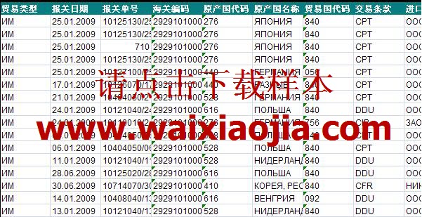 俄羅斯海關(guān)進(jìn)出口數(shù)據(jù)包含運(yùn)輸信息: 報(bào)關(guān)單號、進(jìn)出口類型、通關(guān)方式、離岸國、原產(chǎn)國名稱、目的國代碼、交易條款、交貨地、匯率、合同貨幣、交易性質(zhì)、發(fā)貨日期、交易行名稱、抵達(dá)日期、貨物信息: 海關(guān)編碼、產(chǎn)品描述、生產(chǎn)廠家名稱、商標(biāo) \ 原產(chǎn)地、商品包裝類型及嘜頭、包裝件數(shù) 毛重 / 公斤、凈重 / 公斤、貨物發(fā)票值、貨物海關(guān)值