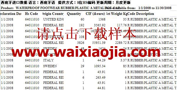 數(shù)據(jù)項(xiàng)目包含三大項(xiàng)目:進(jìn)出口商統(tǒng)計(jì): 日期、 HS 編碼、 HS 描述、公司名稱(數(shù)據(jù)年度更新)西班牙海關(guān)數(shù)據(jù)、進(jìn)出口商相關(guān)報(bào)告:公司名稱、公司基本信息、進(jìn)出口國別和區(qū)域、進(jìn)口商品類別、加強(qiáng)信息 進(jìn)出口商量?jī)r(jià)統(tǒng)計(jì): HS 編碼 ,交易國別 ,月份 ,交易數(shù)量 ,交易金額