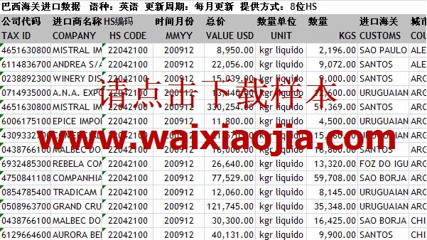 巴西進(jìn)口、出口提單數(shù)據(jù),以巴西本土企業(yè)向全球 200 多個(gè)國(guó)家和地區(qū)進(jìn)口各類(lèi)商品的提貨單為依據(jù)。按照具體產(chǎn)品的精確 HS 編碼提供。 內(nèi)容包括:貿(mào)易方向(進(jìn)口、出口)、巴西進(jìn)口商企業(yè)、各國(guó)出口商企業(yè)、 HS 編碼、產(chǎn)品描述、提單描述、貿(mào)易方式、產(chǎn)品重量、數(shù)量、數(shù)量單位、總金額、集裝箱尺寸、抵達(dá)港口、到港日期、月份、中轉(zhuǎn)國(guó)、中轉(zhuǎn)港口、原產(chǎn)地、國(guó)際港口名稱(chēng)、船公司、代理公司、通知人等信息。
