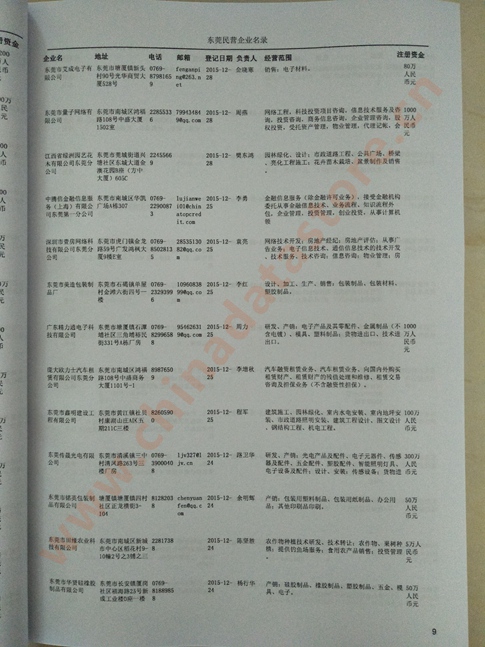 2021版最新東莞企業(yè)黃頁包括《東莞制造企業(yè)黃頁》、《東莞貿(mào)易企業(yè)黃頁》、《東莞民營企業(yè)黃頁》、《東莞外資企業(yè)黃頁》、《東莞外貿(mào)企業(yè)黃頁》共五冊(cè),現(xiàn)優(yōu)惠價(jià):280元/冊(cè)。每?jī)?cè)內(nèi)容包括:?jiǎn)挝幻Q、地址、郵編、電話、傳真、郵箱、經(jīng)營范圍等;東莞企業(yè)黃頁涵蓋了近幾年來最新成立的、有一定規(guī)模的企業(yè),具有非常高的營銷價(jià)值。有了這套黃頁開展業(yè)務(wù)也有了針對(duì)性,也省去了盲目去尋找客戶名單而浪費(fèi)的時(shí)間了,工作效率也會(huì)有很大的提高。歡迎需要東莞企業(yè)黃頁的朋友及時(shí)聯(lián)系我們!