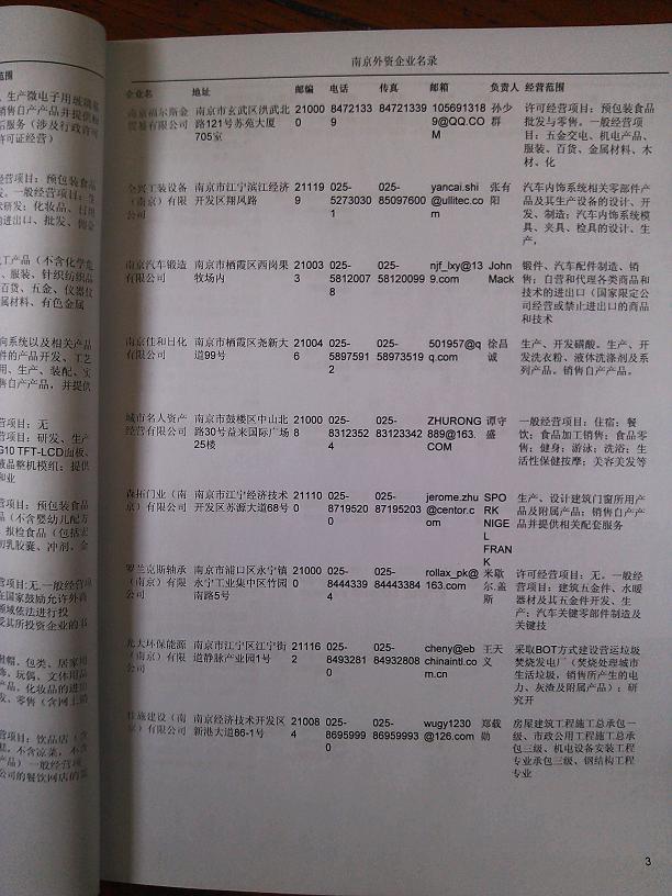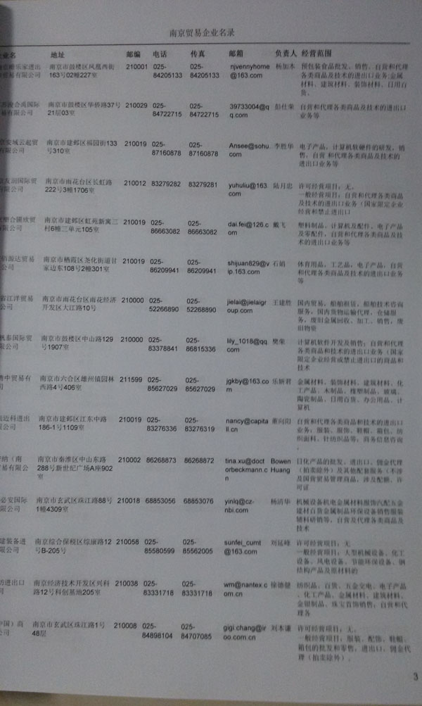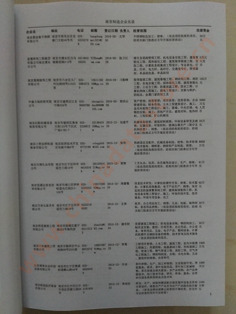 2021版最新南京企業(yè)黃頁(yè)包括《南京制造企業(yè)黃頁(yè)》、《南京貿(mào)易企業(yè)黃頁(yè)》、《南京民營(yíng)企業(yè)黃頁(yè)》、《南京外資企業(yè)黃頁(yè)》、《南京外貿(mào)企業(yè)黃頁(yè)》共五冊(cè),現(xiàn)優(yōu)惠價(jià):280元/冊(cè)。每?jī)?cè)內(nèi)容包括:?jiǎn)挝幻Q、地址、郵編、電話、傳真、郵箱、經(jīng)營(yíng)范圍等;南京企業(yè)黃頁(yè)涵蓋了近幾年來(lái)最新成立的、有一定規(guī)模的企業(yè),具有非常高的營(yíng)銷價(jià)值。有了這套黃頁(yè)開展業(yè)務(wù)也有了針對(duì)性,也省去了盲目去尋找客戶名單而浪費(fèi)的時(shí)間了,工作效率也會(huì)有很大的提高。歡迎需要南京企業(yè)黃頁(yè)的朋友及時(shí)聯(lián)系我們!