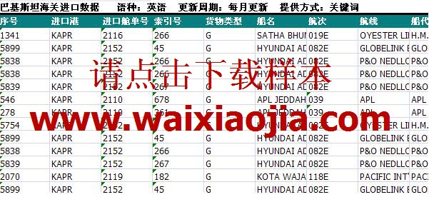 巴基斯坦海關(guān)進(jìn)口數(shù)據(jù)(PKCD of Imports)共28個(gè)字段,含:產(chǎn)品描述、數(shù)量、國(guó)外出口商、巴基斯坦進(jìn)口商、巴基斯坦進(jìn)口商地址、提單日期、目的港、單位、進(jìn)口國(guó)、序號(hào)、艙單日期、起運(yùn)港、運(yùn)輸方式、艙單號(hào)、船名、航線、船代、提單號(hào)等。