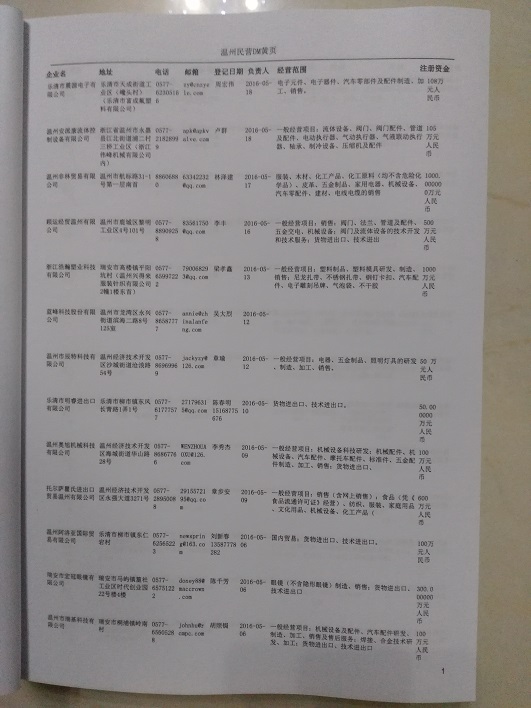 2021版最新溫州企業(yè)黃頁包括《溫州制造企業(yè)黃頁》、《溫州貿(mào)易企業(yè)黃頁》、《溫州民營企業(yè)黃頁》、《溫州外資企業(yè)黃頁》、《溫州外貿(mào)企業(yè)黃頁》共五冊,現(xiàn)優(yōu)惠價:280元/冊。每冊內(nèi)容包括:單位名稱、地址、郵編、電話、傳真、郵箱、經(jīng)營范圍等;溫州企業(yè)黃頁涵蓋了近幾年來最新成立的、有一定規(guī)模的企業(yè),具有非常高的營銷價值。有了這套黃頁開展業(yè)務(wù)也有了針對性,也省去了盲目去尋找客戶名單而浪費(fèi)的時間了,工作效率也會有很大的提高。歡迎需要溫州企業(yè)黃頁的朋友及時聯(lián)系我們!