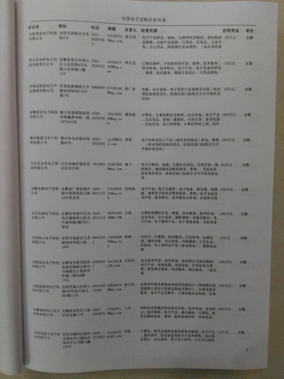 2024年新版中國(guó)電子采購(gòu)企業(yè)黃頁(yè),收錄了全國(guó)各地經(jīng)營(yíng)范圍涉及電子產(chǎn)品的貿(mào)易企業(yè),這些都是頗具實(shí)力的電子產(chǎn)品的中國(guó)采購(gòu)商。黃頁(yè)內(nèi)容包含:企業(yè)名稱、地址、電話、傳真、郵箱、經(jīng)營(yíng)范圍、省份、注冊(cè)資金等信息。該套黃頁(yè)包含一個(gè)黃頁(yè)光碟加一冊(cè)紙質(zhì)書(shū)刊,全國(guó)價(jià)格:1500元,省/直轄市價(jià)格:400元,城市價(jià)格:200元,共收錄了全國(guó)各地大概106195(統(tǒng)計(jì)日期:2018.1)家電子產(chǎn)品采購(gòu)企業(yè)。黃頁(yè)光碟中是EXCEL格式,信息可任意修改、復(fù)制、打印、導(dǎo)出及導(dǎo)入到傳真、郵件群發(fā)等軟件中,無(wú)任何限制。