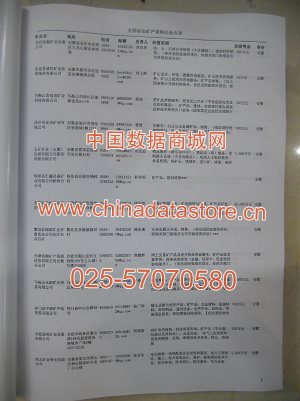2024年新版中國冶金礦產(chǎn)采購企業(yè)黃頁,收錄了全國各地經(jīng)營范圍涉及冶金礦產(chǎn)產(chǎn)品的貿(mào)易企業(yè),這些都是頗具實(shí)力的冶金礦產(chǎn)產(chǎn)品的中國采購商。黃頁內(nèi)容包含:企業(yè)名稱、地址、電話、傳真、郵箱、經(jīng)營范圍、省份、注冊資金等信息。該套黃頁包含一個黃頁光碟加一冊紙質(zhì)書刊,全國價格:1500元,省/直轄市價格:400元,城市價格:200元,共收錄了全國各地大概8042(統(tǒng)計(jì)日期:2018.1)家冶金礦產(chǎn)產(chǎn)品采購企業(yè)。黃頁光碟中是EXCEL格式,信息可任意修改、復(fù)制、打印、導(dǎo)出及導(dǎo)入到傳真、郵件群發(fā)等軟件中,無任何限制。