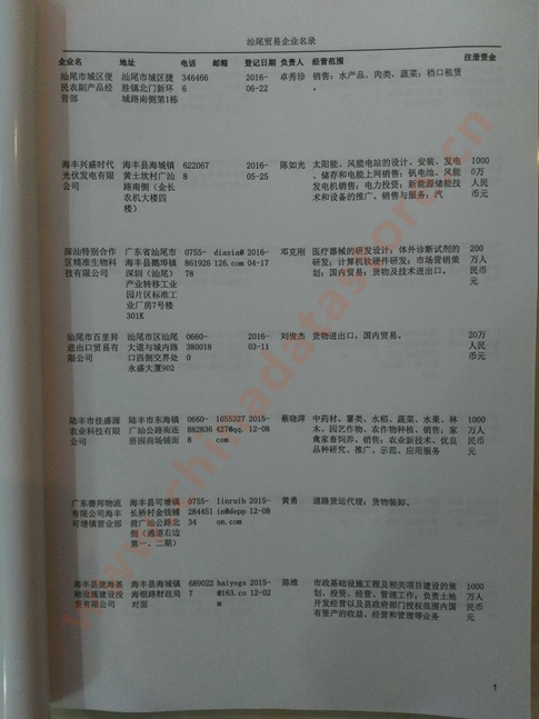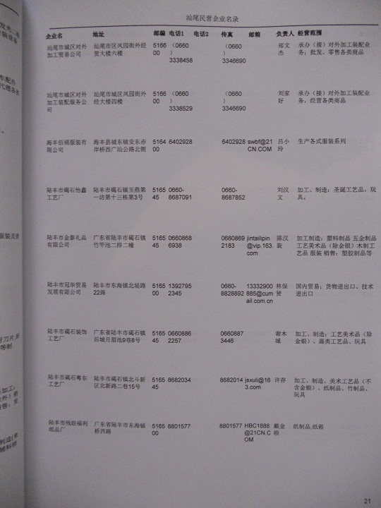 2021版最新汕尾企業(yè)黃頁包括《汕尾制造企業(yè)黃頁》、《汕尾民營企業(yè)黃頁》,現(xiàn)優(yōu)惠價:280元/冊。每冊內(nèi)容包括:單位名稱、地址、郵編、電話、傳真、郵箱、經(jīng)營范圍等;汕尾企業(yè)黃頁涵蓋了近幾年來最新成立的、有一定規(guī)模的企業(yè),具有非常高的營銷價值。有了這套黃頁開展業(yè)務(wù)也有了針對性,也省去了盲目去尋找客戶名單而浪費的時間了,工作效率也會有很大的提高。歡迎需要汕尾企業(yè)黃頁的朋友及時聯(lián)系我們!
