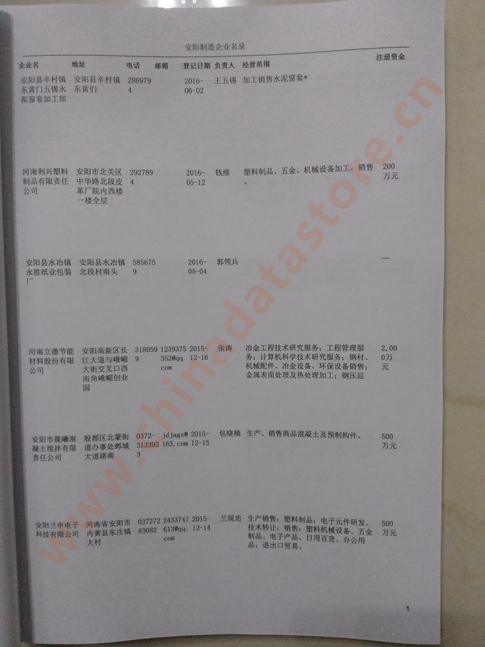 2021版最新安陽企業(yè)黃頁(yè)包括《安陽制造企業(yè)黃頁(yè)》、《安陽民營(yíng)企業(yè)黃頁(yè)》,現(xiàn)優(yōu)惠價(jià):280元/冊(cè)。每?jī)?cè)內(nèi)容包括:?jiǎn)挝幻Q、地址、郵編、電話、傳真、郵箱、經(jīng)營(yíng)范圍等;安陽企業(yè)黃頁(yè)涵蓋了近幾年來最新成立的、有一定規(guī)模的企業(yè),具有非常高的營(yíng)銷價(jià)值。有了這套黃頁(yè)開展業(yè)務(wù)也有了針對(duì)性,也省去了盲目去尋找客戶名單而浪費(fèi)的時(shí)間了,工作效率也會(huì)有很大的提高。歡迎需要安陽企業(yè)黃頁(yè)的朋友及時(shí)聯(lián)系我們!