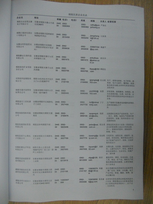 2021版最新銅陵企業(yè)黃頁包括《銅陵制造企業(yè)黃頁》、《銅陵民營企業(yè)黃頁》,現(xiàn)優(yōu)惠價:280元/冊。每冊內(nèi)容包括:單位名稱、地址、郵編、電話、傳真、郵箱、經(jīng)營范圍等;銅陵企業(yè)黃頁涵蓋了近幾年來最新成立的、有一定規(guī)模的企業(yè),具有非常高的營銷價值。有了這套黃頁開展業(yè)務(wù)也有了針對性,也省去了盲目去尋找客戶名單而浪費(fèi)的時間了,工作效率也會有很大的提高。歡迎需要銅陵企業(yè)黃頁的朋友及時聯(lián)系我們!