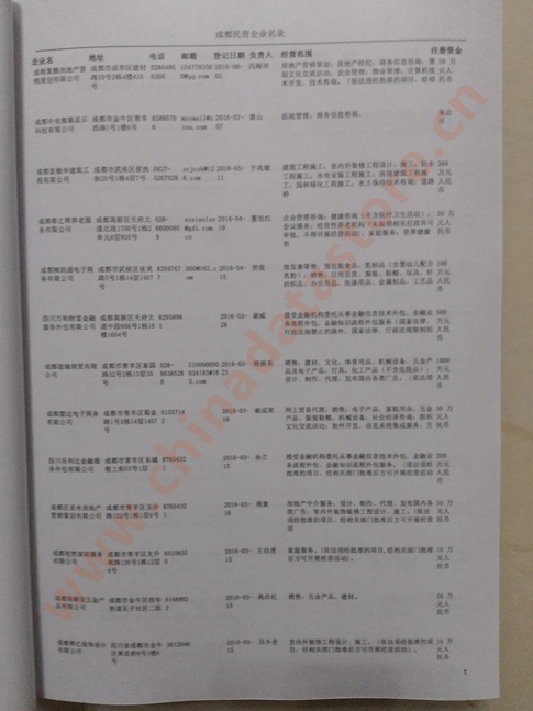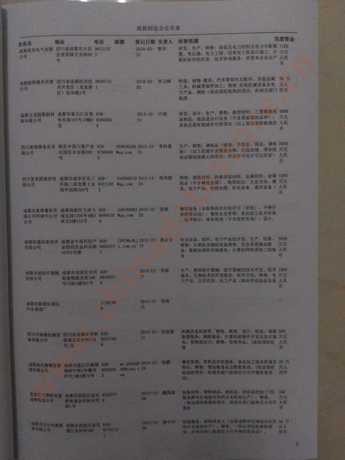 2021版最新成都企業(yè)黃頁包括《成都制造企業(yè)黃頁》、《成都民營企業(yè)黃頁》,現(xiàn)優(yōu)惠價(jià):280元/冊。每冊內(nèi)容包括:單位名稱、地址、郵編、電話、傳真、郵箱、經(jīng)營范圍等;成都企業(yè)黃頁涵蓋了近幾年來最新成立的、有一定規(guī)模的企業(yè),具有非常高的營銷價(jià)值。有了這套黃頁開展業(yè)務(wù)也有了針對性,也省去了盲目去尋找客戶名單而浪費(fèi)的時(shí)間了,工作效率也會有很大的提高。歡迎需要成都企業(yè)黃頁的朋友及時(shí)聯(lián)系我們!