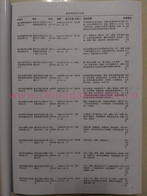 2021版最新重慶企業(yè)黃頁包括《重慶制造企業(yè)黃頁》、《重慶民營企業(yè)黃頁》,現(xiàn)優(yōu)惠價:280元/冊。每冊內(nèi)容包括:單位名稱、地址、郵編、電話、傳真、郵箱、經(jīng)營范圍等;重慶企業(yè)黃頁涵蓋了近幾年來最新成立的、有一定規(guī)模的企業(yè),具有非常高的營銷價值。有了這套黃頁開展業(yè)務(wù)也有了針對性,也省去了盲目去尋找客戶名單而浪費的時間了,工作效率也會有很大的提高。歡迎需要重慶企業(yè)黃頁的朋友及時聯(lián)系我們!
