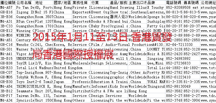 簡介:2015年香港貿(mào)發(fā)局展會會刊共收錄28個展會參展商信息。數(shù)據(jù)格式EXCEL,會刊內(nèi)容包含:公司名稱、地址、地區(qū)、業(yè)務(wù)性質(zhì)、行業(yè)、產(chǎn)品服務(wù)范圍、出口市場、電話、傳真、網(wǎng)址。