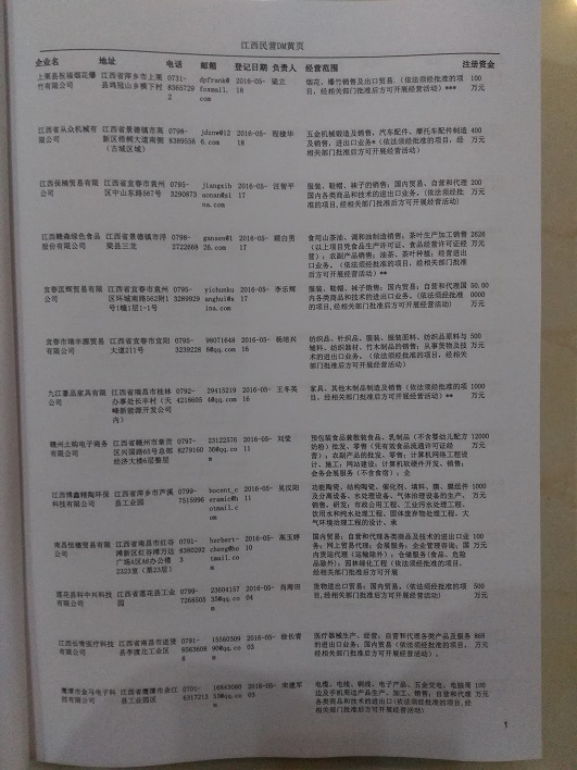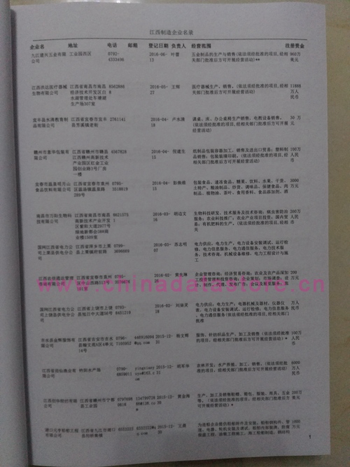 2021版最新江西企業(yè)黃頁(yè)包括《江西制造企業(yè)黃頁(yè)》、《江西貿(mào)易企業(yè)黃頁(yè)》、《江西民營(yíng)企業(yè)黃頁(yè)》共三冊(cè),優(yōu)惠價(jià):280元/冊(cè)。每?jī)?cè)內(nèi)容包括:?jiǎn)挝幻Q、地址、郵編、電話、傳真、郵箱、經(jīng)營(yíng)范圍等;江西企業(yè)黃頁(yè)涵蓋了近幾年來最新成立的、有一定規(guī)模的企業(yè),具有非常高的營(yíng)銷價(jià)值。有了這套黃頁(yè)開展業(yè)務(wù)也有了針對(duì)性,也省去了盲目去尋找客戶名單而浪費(fèi)的時(shí)間了,工作效率也會(huì)有很大的提高。歡迎需要江西企業(yè)黃頁(yè)的朋友及時(shí)聯(lián)系我們!