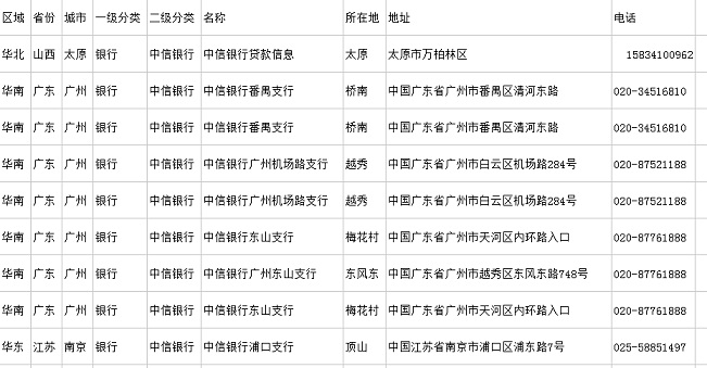 數(shù)據(jù)介紹:包含字段:包含字段:區(qū)域、省份、城市、一級(jí)分類(lèi)、二級(jí)分類(lèi)、名稱(chēng)、所在地、地址、電話(huà)