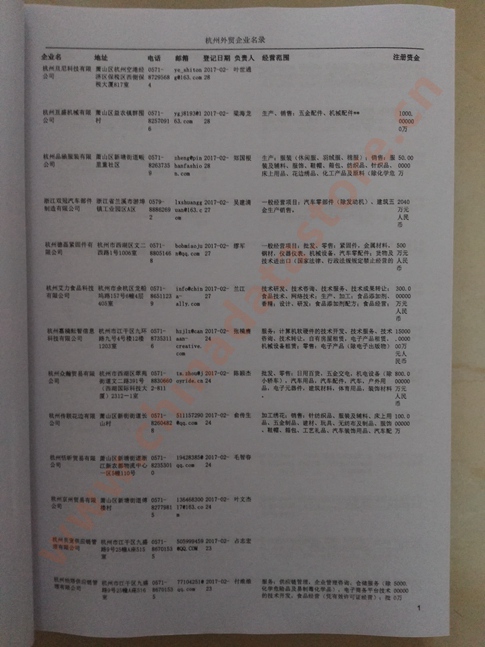 杭州外貿(mào)企業(yè)黃頁包括:外貿(mào)企業(yè)名稱、地址、電話、傳真、郵箱、經(jīng)營范圍、注冊資金等信息。