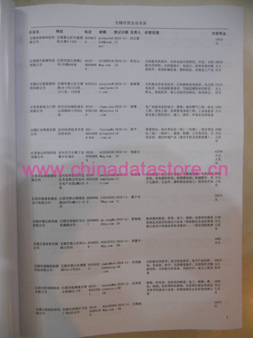無錫外貿(mào)企業(yè)黃頁包括:外貿(mào)企業(yè)名稱、地址、電話、傳真、郵箱、經(jīng)營范圍、注冊(cè)資金等信息。