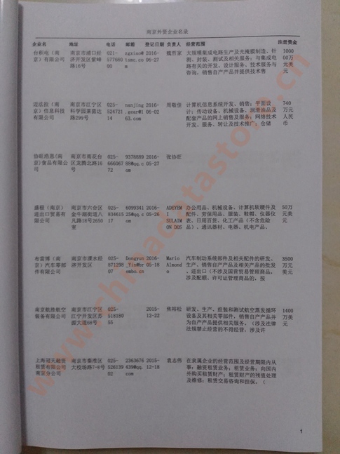南京外貿(mào)企業(yè)黃頁包括:外貿(mào)企業(yè)名稱、地址、電話、傳真、郵箱、經(jīng)營范圍、注冊資金等信息。