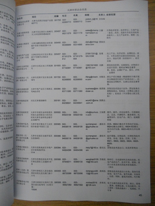天津外貿(mào)企業(yè)黃頁包括:外貿(mào)企業(yè)名稱、地址、電話、傳真、郵箱、經(jīng)營范圍、注冊資金等信息。