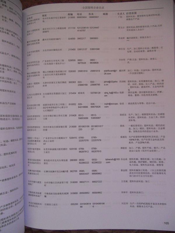 塑料制品外貿(mào)企業(yè)黃頁包括:外貿(mào)企業(yè)名稱、地址、電話、傳真、郵箱、經(jīng)營范圍、注冊資金等信息。