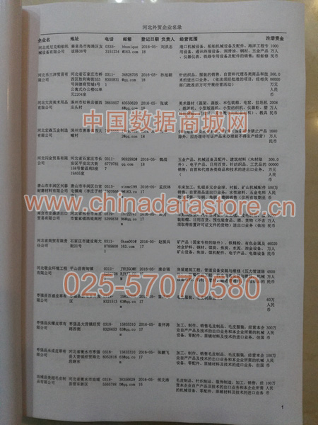 河北外貿(mào)企業(yè)黃頁包括:外貿(mào)企業(yè)名稱、地址、電話、傳真、郵箱、經(jīng)營范圍、注冊(cè)資金等信息。