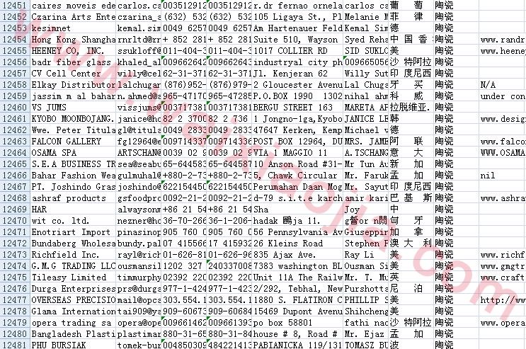陶瓷采購(gòu)商名單數(shù)據(jù)為Excel格式,信息可任意修改、復(fù)制、打印、導(dǎo)出及導(dǎo)入到傳真、郵件群發(fā)等軟件中,無(wú)任何限制。