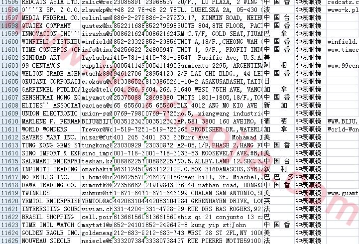 鐘表眼鏡采購商名單數(shù)據(jù)為Excel格式,信息可任意修改、復(fù)制、打印、導(dǎo)出及導(dǎo)入到傳真、郵件群發(fā)等軟件中,無任何限制。
