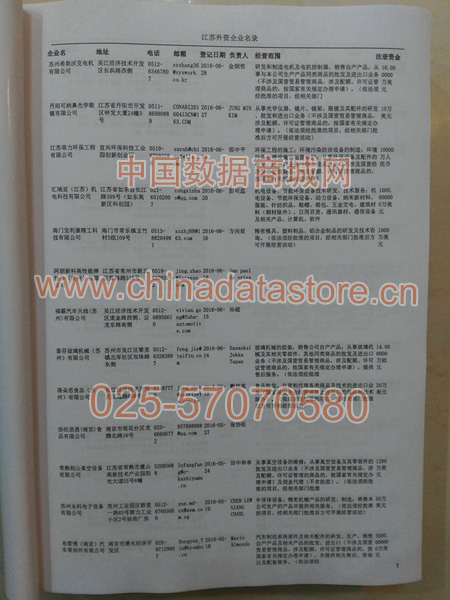 最新江蘇外資企業(yè)黃頁(yè)數(shù)據(jù)涵蓋了江蘇外商獨(dú)資企業(yè)、中外合資經(jīng)營(yíng)企業(yè)以及港、澳、臺(tái)資企業(yè),包括江蘇臺(tái)資日資企業(yè)黃頁(yè),江蘇外企黃頁(yè)具體內(nèi)容包括:企業(yè)名稱、地址、電話、傳真、郵箱、經(jīng)營(yíng)范圍、注冊(cè)資金等信息;江蘇外資企業(yè)黃頁(yè)里面的企業(yè)都一些中外合資的大企業(yè),這些公司經(jīng)濟(jì)實(shí)力都比較雄厚,出口產(chǎn)品也比較多,業(yè)務(wù)范圍都比較廣,跟他們開展業(yè)務(wù)往來(lái)都比較容易;有了江蘇臺(tái)企日企黃頁(yè)開展業(yè)務(wù)也有了針對(duì)性,也省去了盲目去尋找客戶名單而浪費(fèi)的時(shí)間了,工作效率也會(huì)有很大的提高.歡迎需要的客戶及時(shí)聯(lián)系我們!