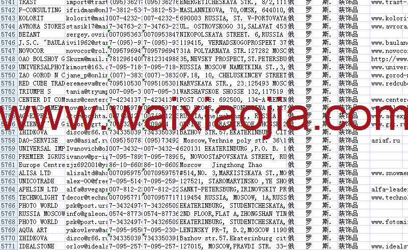 俄羅斯采購商名單數(shù)據(jù)為Excel格式,信息可任意修改、復(fù)制、打印、導(dǎo)出及導(dǎo)入到傳真、郵件群發(fā)等軟件中,無任何限制。